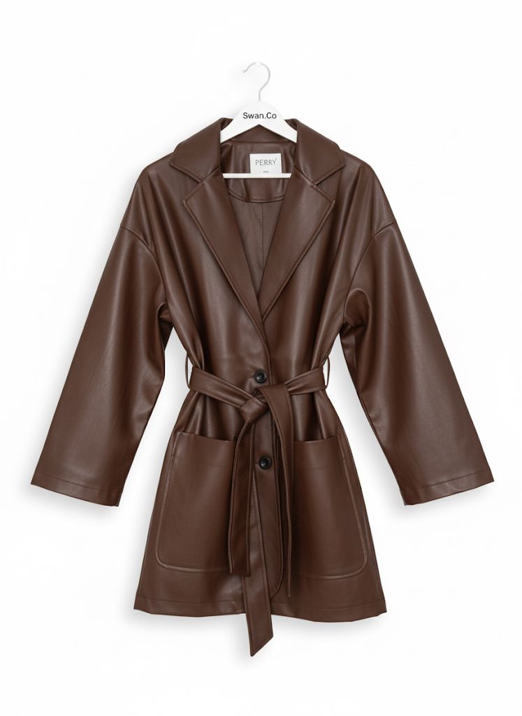 Acı kahve rengi deri trenç, kemerli tasarımıyla bele zarif bir vurgu yapar ve modern bir silüet yaratır. Yumuşak ama dayanıklı deri dokusu, her kombinde sofistike bir hava sağlar; ofisten akşam buluşmalarına kadar stilinizi tamamlar.