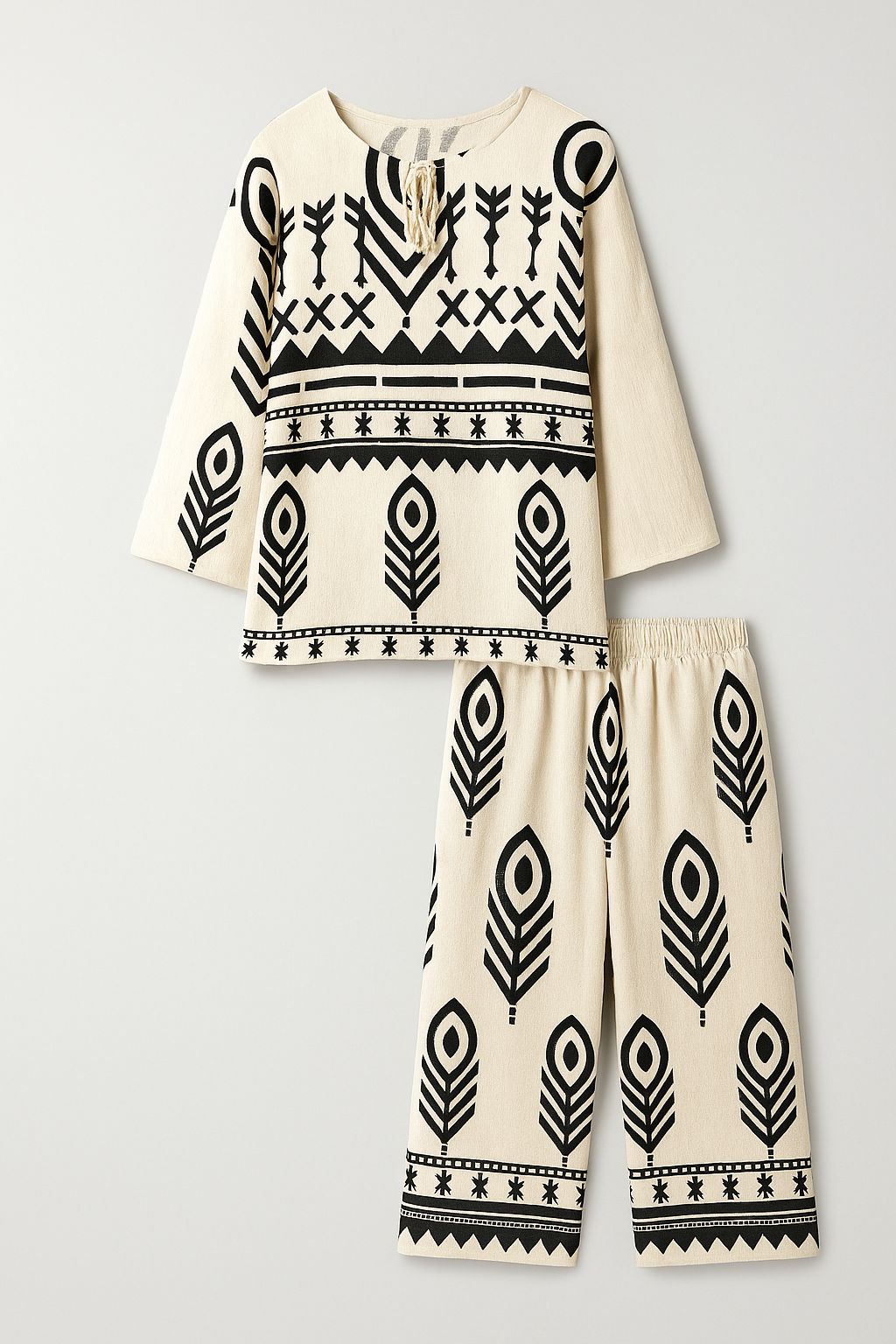 Doğal tonlarda hazırlanmış bu ikili takım, siyah etnik desenleriyle özgün bir görünüm sunuyor. Rahat kesimli üst parçası ve lastikli pantolonu sayesinde konforlu bir kullanım sağlarken, desen detaylarıyla bohem ve modern bir tarzı bir araya getiriyor. Günlük stilinizde fark yaratmak veya özel davetlerde özgün bir hava katmak için ideal.