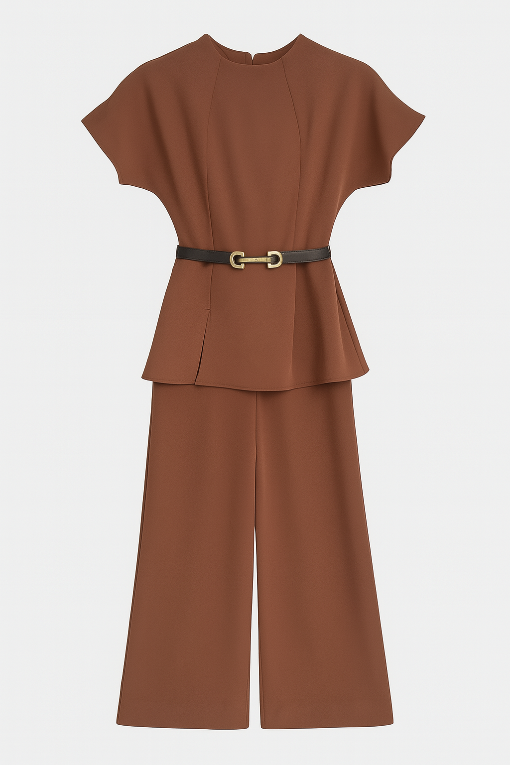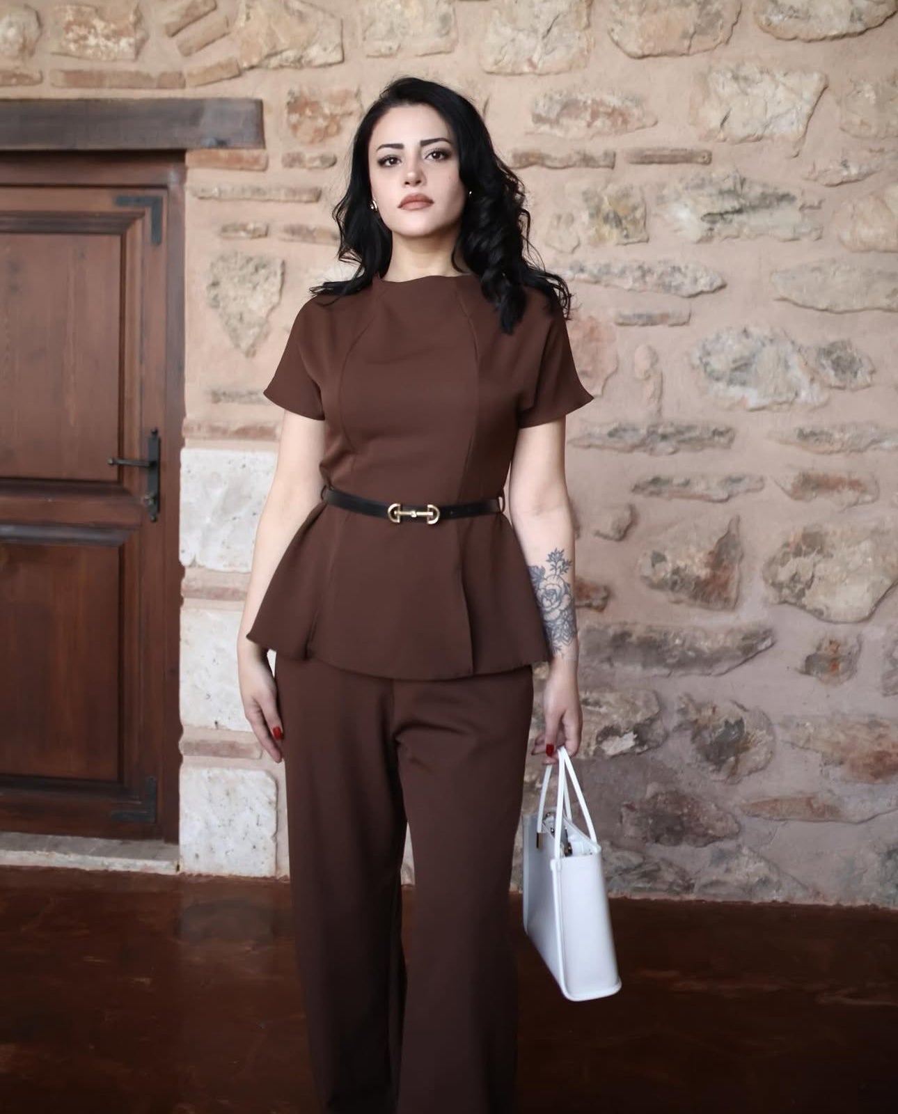 Zarif kesimi ve dökümlü formuyla dikkat çeken Chestnut Grace Takım, modern kadının güçlü duruşunu yansıtır. Bel vurgusunu zarifçe ön plana çıkaran siyah tokalı kemer detayı, şıklığı minimal bir ifadeyle tamamlar. Gün boyu konfor sağlarken görünümünüzü sofistike bir çizgiye taşır.