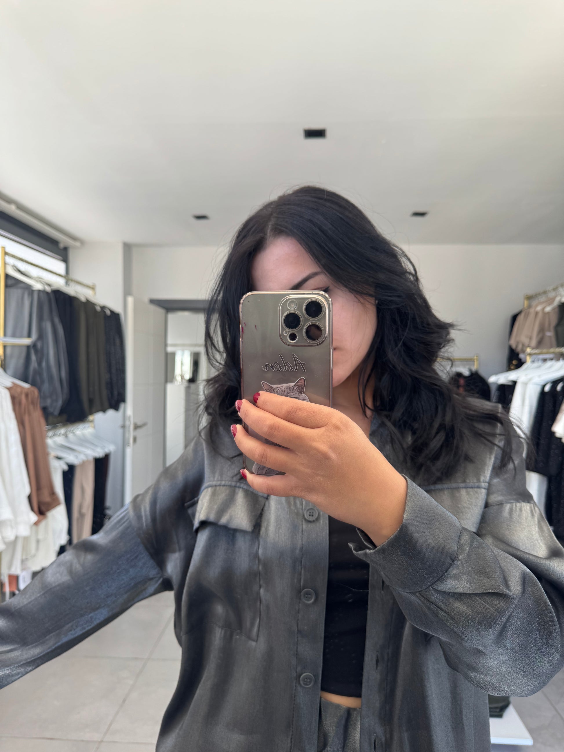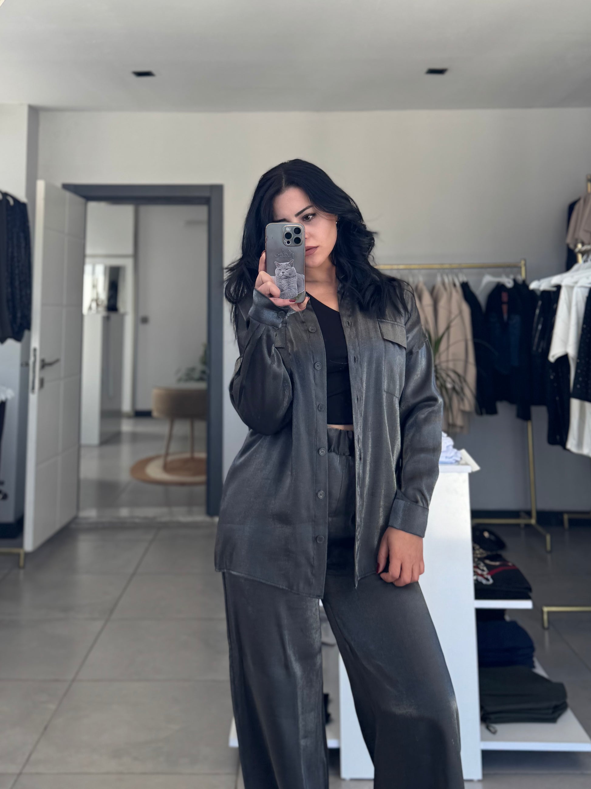 Luna Twin Set, sade siluetini gri simli dokusuyla aydınlatıyor. Işığı zarifçe yansıtan yüzeyi, hem geceye hem gündüze uyum sağlıyor.Üstü dökümlü, altı düz kesim formu ile birlikte konfor ve şıklığı bir araya getirir. Minimal kesim, parlak dokuyla birleştiğinde güçlü ama yumuşak bir ifade yaratır.