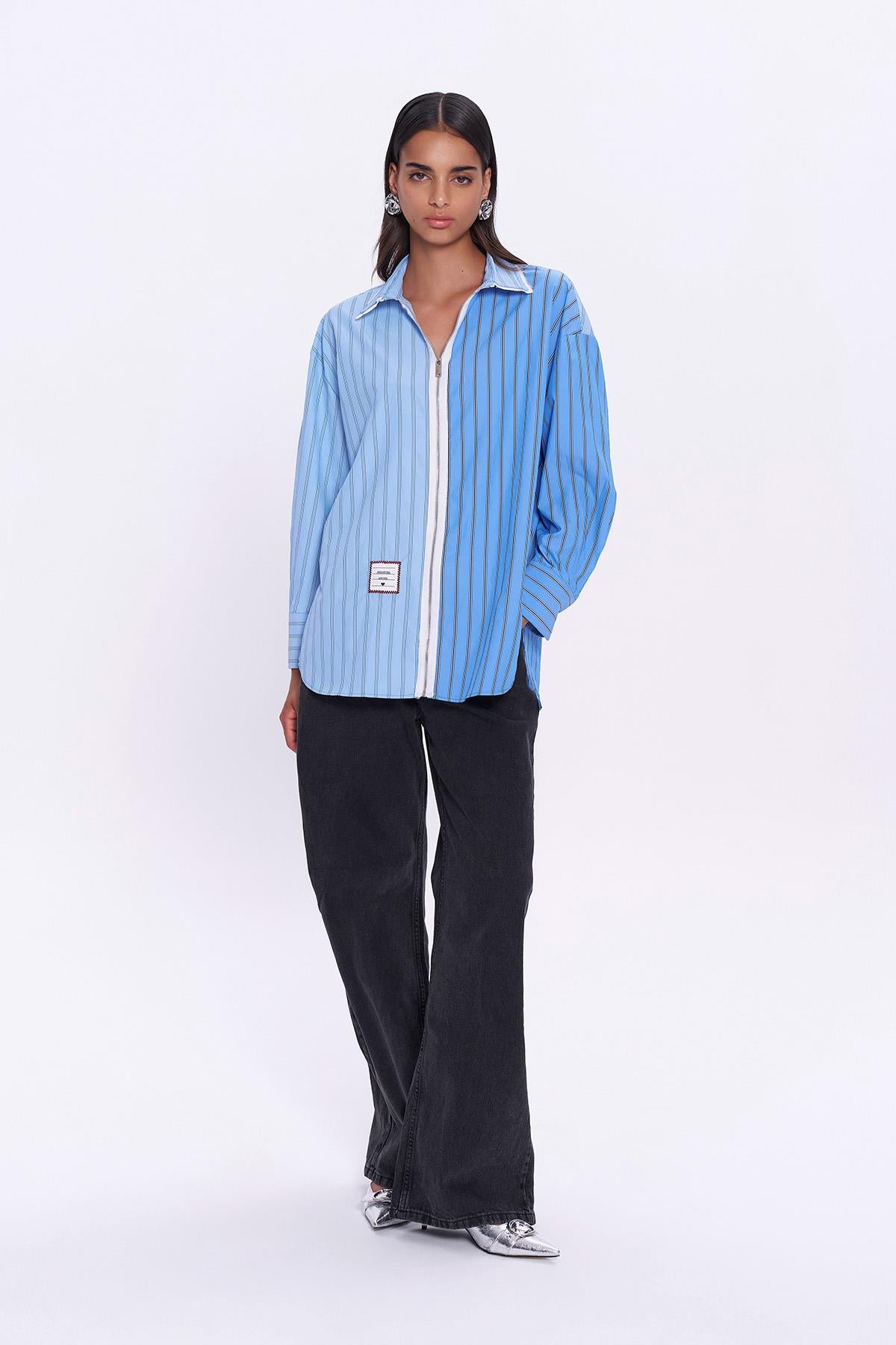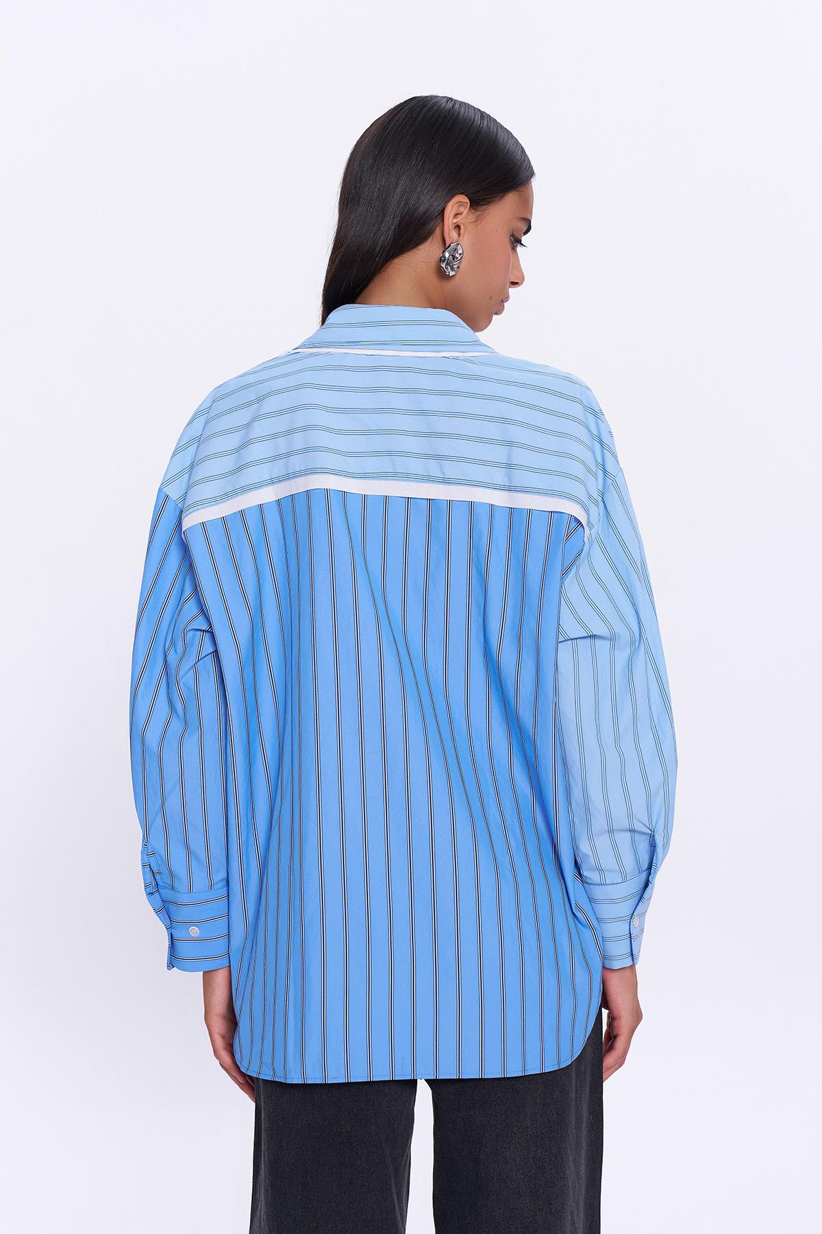 İnce çizgili mavi gömlek. Hafif, nefes alan kumaş dokusu ve rahat kalıbıyla gün boyu konfor sağlar. Basic parçalarla kombinlendiğinde zahmetsiz şıklık sunar.