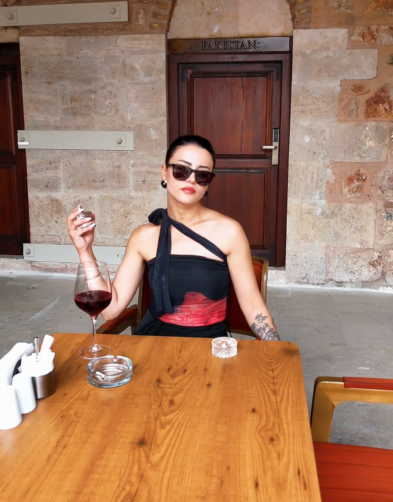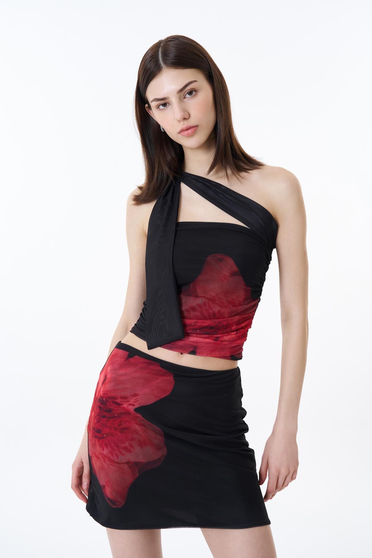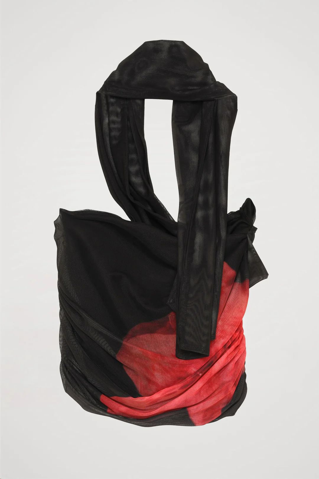 Sanatsal bir dokunuşla şekillenen Midnight Flame, vücudu saran transparan tül kumaşı ve ateş kırmızısı geçişleriyle dikkat çekiyor. Asimetrik tasarımı ve drape detaylarıyla güçlü bir siluet yaratırken, feminenliğe karanlık bir romantizm katıyor. İç giyimde minimal bir parça ile ya da tek başına cesur bir duruşla kullanılabilir.