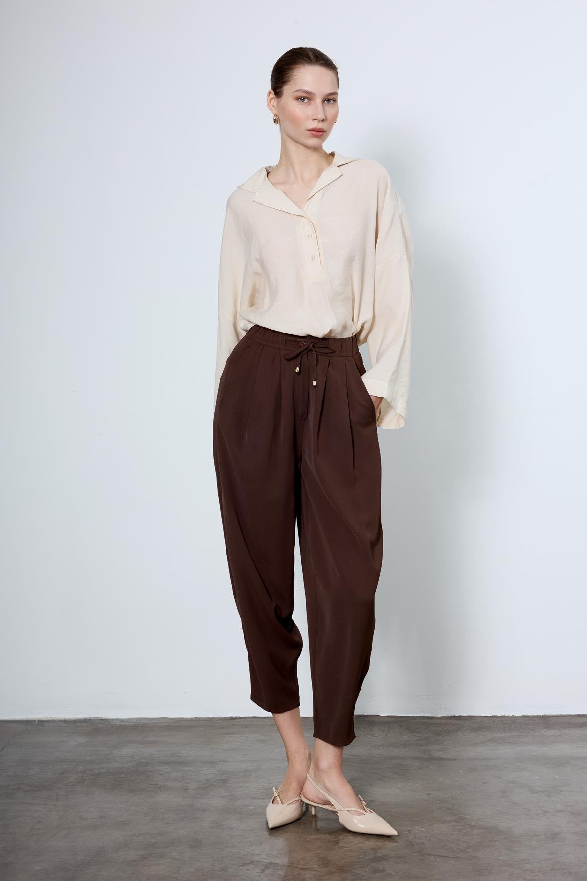 Mocha Pants, sade ama güçlü bir duruşun simgesi. Bol kesimiyle akışkan bir form yaratırken, acı kahve tonuyla sezonun en sofistike enerjisini yansıtıyor. Gömleklerle klasik, deri parçalarla modern bir görünüm.