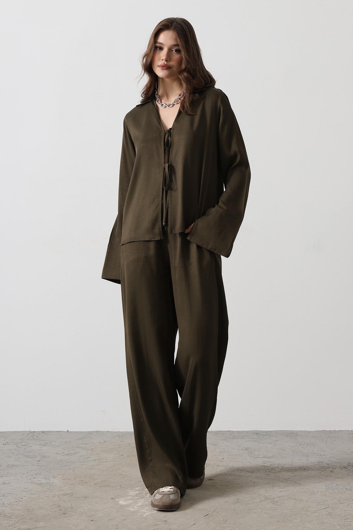 Akıcı saten dokusuyla ışığı her açıdan yansıtan bu ön bağlamalı takım, hem güçlü hem de feminen bir silueti vurgular.