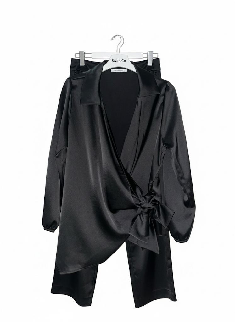 Siyah saten kumaştan tasarlanan bu takım, önden bağlamalı detayıyla bele zarif bir vurgu yapar ve modern bir silüet yaratır. Üst ve alt parçaları takım olarak güçlü bir stil sunarken, ayrı kullanıldığında farklı kombinlere de imkan tanır. Günlük veya özel davetlerde sofistike bir görünüm sağlar.