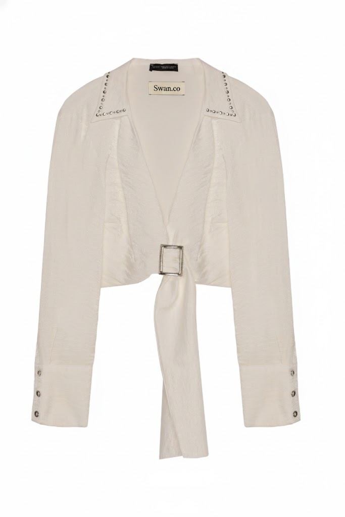 White Rebel Crop, sade beyazın zamansız zarafetini, zımba detaylarıyla modern bir enerjiye dönüştürüyor. Ön bağlama formu ve kısa kesimiyle vücut hattını zarifçe öne çıkarır. Hem cesur hem sade — Swan kadınının imzası.