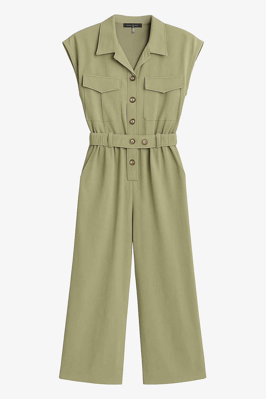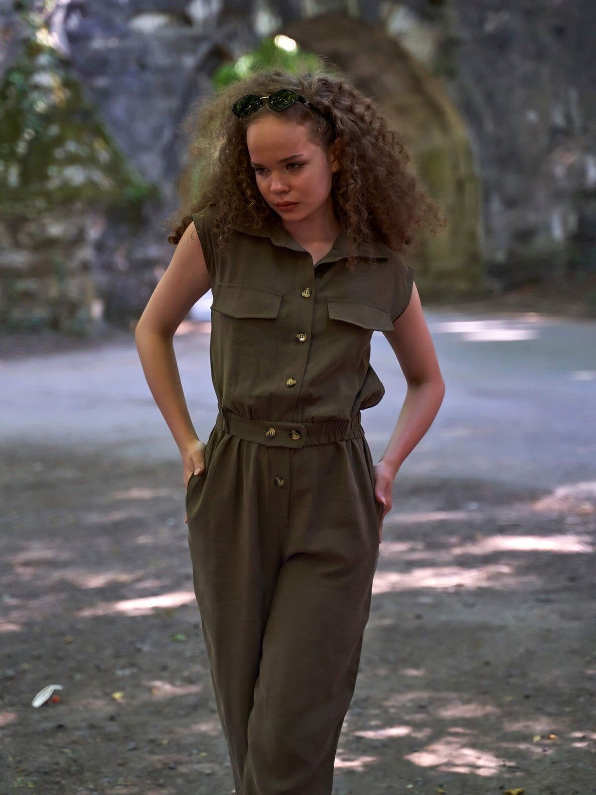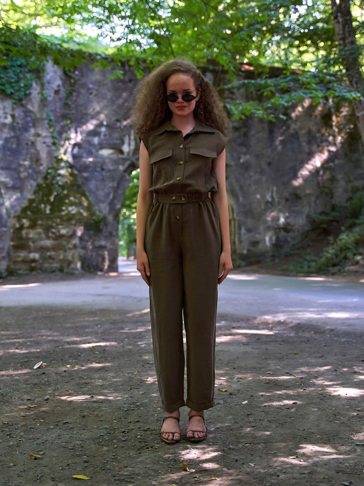 Modern şehirli kadının özgüvenli ve cesur adımlarından ilham alan “Safari” tulum, fonksiyonel cepleri ve beli vurgulayan kemeriyle güçlü bir siluet sunar. Hafif kumaşı sayesinde yaz günlerinde ferahlık sağlarken, düğme detaylarıyla zamansız bir stil yaratır. Gündüzden geceye her an kullanabileceğiniz joker parçanız olmaya aday.