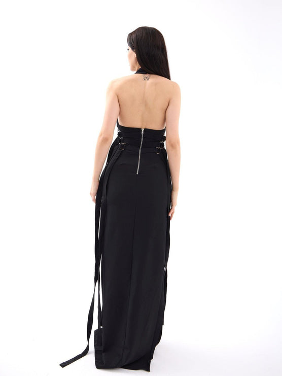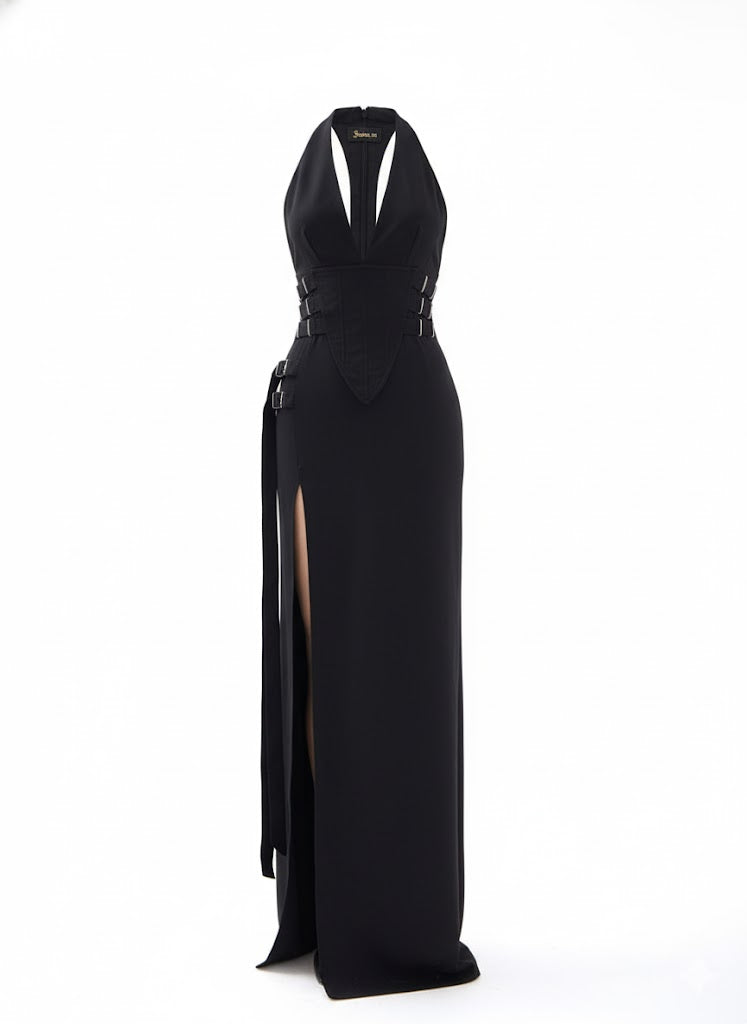 Siyahın zamansız zarafetini zımba detaylarıyla yeniden tanımlıyor. Uzun formu, yüksek yırtmacı ve güçlü hatlarıyla Swan kadınının özgüvenini yansıtır. Minimal takılarla geceye, deri detaylarla modern bir stile dönüşür.